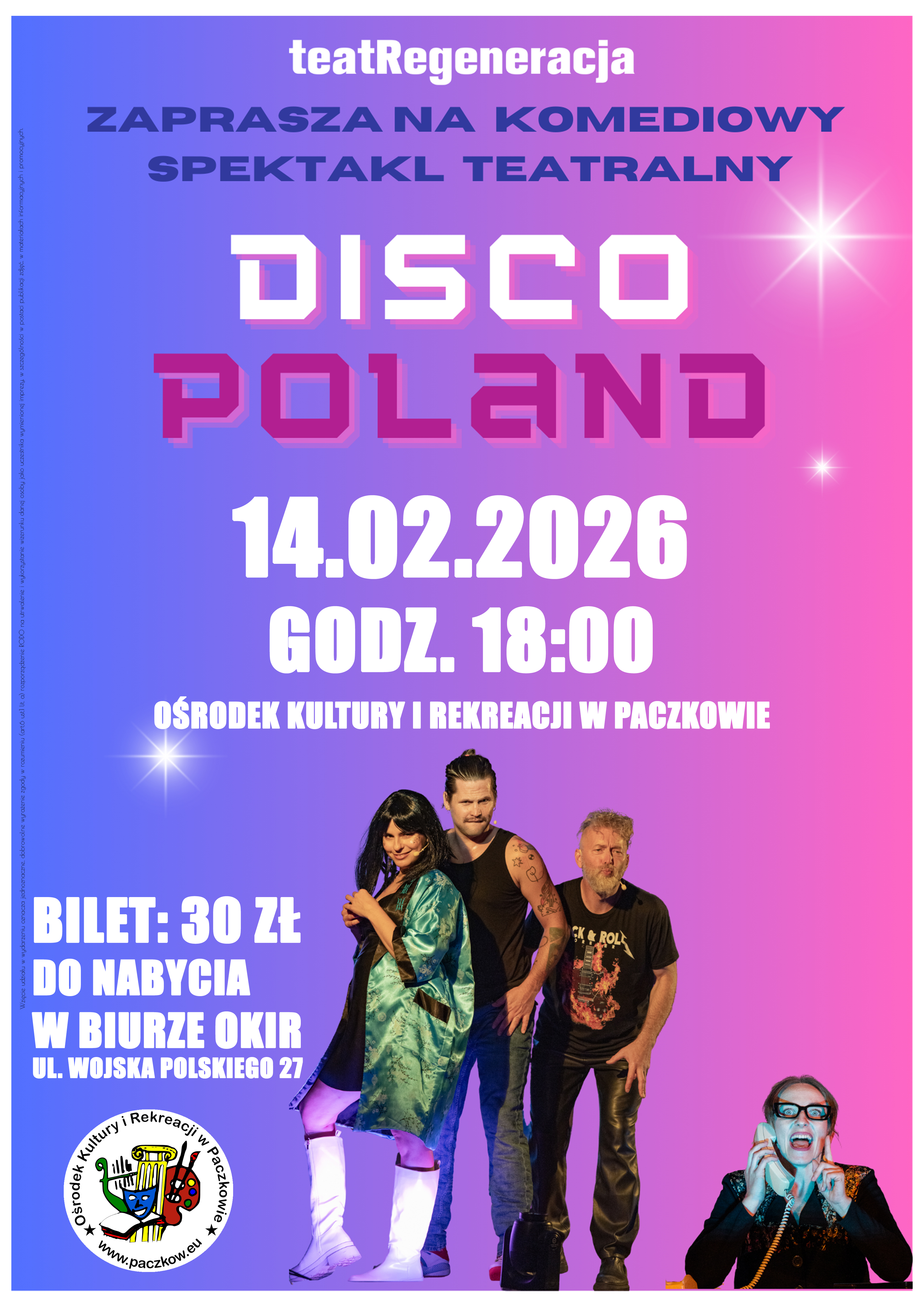 „Disco Poland” to niezwykle kolorowa komediowa opowieść o pieniądzach, urzędach, wnioskach do wypełnienia, a także o przyjaźni, marzeniach i absurdach życia w kraju, gdzie karierę w disco polo może zrobić każdy. Nie liczy się talent, a determinacja i dążenie do celu, nawet jeśli trzeba poświęcić wszystko. Serdecznie zapraszamy na najnowszą produkcję teatRegeneracja przeznaczoną dla dorosłych. Zapnijcie wrotki.